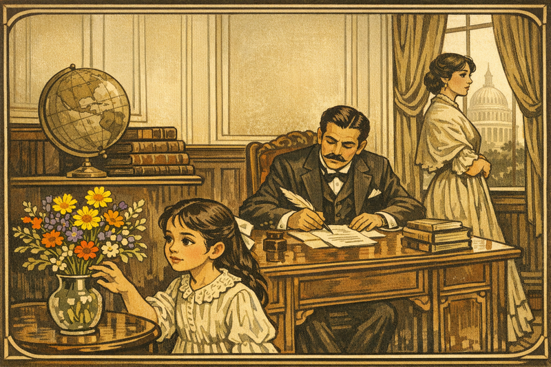 This session will be a series of illustrations for a graphic novel about Mexican biologist Enrique Mexia. Use an Art Nouveau / early Modernist visual style reflecting the 1920s–1930s period. Use a bright pallet of colors that pop out at the user and have a Mexican color theme. Balance scientific rigor with the spirit of adventure, showing students that it is never too late to follow a passion and make world-changing contributions to science. Please generate a 16:9 image in a warm, late-Victorian illustration style depicting Panel 1. The scene shows a young girl of about 10 years old with dark hair and curious eyes standing in a grand but austere parlor in Washington, D.C., circa 1880. Her father, Mexican diplomat Enrique Mexia, sits at a mahogany desk signing documents with a quill, dressed in a formal dark suit. Her mother, Sarah Wilmer, stands near a window looking distant and melancholy. Through the tall window, the U.S. Capitol dome is faintly visible. A globe, stacked leather-bound books, and a vase of wildflowers sit on a side table — the wildflowers are the only vibrant color in the otherwise muted room. The girl reaches toward the flowers with fascination. The color palette uses muted creams, dark woods, and a single splash of wildflower color (yellow, violet, orange). The emotional tone is bittersweet — privilege mixed with family tension.Ynes Enriquetta Julietta Mexia was born on May 24, 1870, in Georgetown, Washington, D.C., the daughter of Mexican diplomat Enrique Mexia and Sarah Wilmer. Her childhood was shaped by constant upheaval — her parents separated early, and she was shuttled between schools in Philadelphia, Ontario, and Maryland. Even as a girl surrounded by politics and formality, Ynes found herself drawn to the natural world, pressing wildflowers between the pages of her father's books.