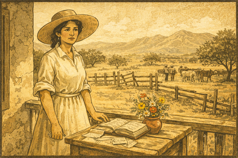 Please generate a 16:9 image in a sun-bleached, early Modernist illustration style depicting Panel 2. The scene shows Ynes Mexia in her late 30s, standing on the porch of a weathered hacienda in rural Mexico, circa 1905. She wears a plain cotton dress with rolled-up sleeves and a wide-brimmed straw hat. Behind her stretches arid ranchland with scattered mesquite trees and a distant mountain range shimmering in heat haze. A wooden fence is in disrepair. On a rough table beside her sits a ledger book, scattered receipts, and a small clay pot of wildflowers she has gathered. Her expression is weary but resolute. In the background, ranch workers tend livestock. The color palette features dusty ochres, bleached whites, sage greens, and terracotta. The emotional tone conveys endurance and quiet determination during difficult years.After her father's death, Mexia moved to Mexico City, where she managed the family ranch for nearly three decades. She married twice — her first husband died shortly after the wedding, and her second marriage ended in divorce amid financial hardship. These were lonely, grueling years spent far from any scientific community. Yet even while balancing account books and overseeing livestock, she collected local plants and studied the landscape around her, nurturing a passion she did not yet have a name for.