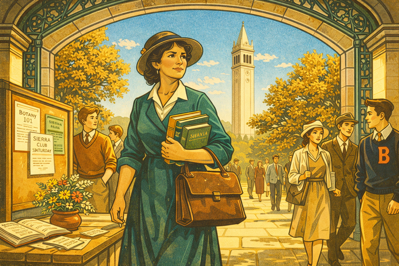 Please generate a 16:9 image in an Art Deco / early Modernist style depicting Panel 3. The scene shows Ynes Mexia, now in her early 50s with graying dark hair pinned up under a modest hat, walking through the arched entrance of UC Berkeley's campus, circa 1921. She carries a leather satchel and a stack of botany textbooks. Around her, young students in 1920s collegiate clothing hurry past — some glance at her curiously. Sather Tower (the Campanile) rises in the background against a clear blue California sky. Oak trees line the path, their leaves golden in autumn light. A bulletin board near the entrance displays notices for "Botany 101" and "Sierra Club Hike — Saturday." The color palette uses warm golds, ivy greens, cream stone, and blue sky. The emotional tone is hopeful and courageous — a woman stepping into a new chapter of her life despite being decades older than her classmates.In 1908, Mexia relocated to San Francisco seeking a fresh start. She joined the Sierra Club, hiked California's wild places, and discovered a community of naturalists who shared her love of plants. At fifty-one, she enrolled as a special student at UC Berkeley to study botany — walking into lecture halls filled with students half her age. She did not let self-consciousness slow her down. For the first time in her life, the passion she had carried for decades had a scientific framework around it.