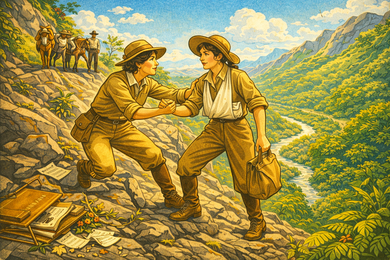 Please generate a 16:9 image in an Art Deco adventure-illustration style depicting Panel 4. Use a brighter pallet of colors showing a progression of positive discovery. The scene shows a botanical field expedition in the mountains of Sinaloa, Mexico, in 1925. Ynes Mexia, age 55, in sturdy khaki field clothes, a wide-brimmed hat, and leather boots, is being helped to her feet by expedition leader Roxana Ferris (a younger woman in similar field attire) after a serious fall on a steep rocky slope. Mexia's arm is in a makeshift sling, but she clutches a specimen bag in her free hand. Scattered around them are a broken botanical press, fallen plant cuttings, and loose journal pages. Below the slope, dense tropical vegetation stretches to a river valley. Two Mexican guides with pack mules wait on the trail above. The bright color palette features jungle greens, rocky grays, warm khaki, and golden afternoon light. The emotional tone is dramatic but resilient — a setback that does not end the journey.In 1925, Mexia joined a Stanford University expedition to Sinaloa, Mexico, led by botanist Roxana Ferris. It was her first real fieldwork — and it nearly ended her career before it started. While climbing a steep slope to reach a promising collecting site, she fell and seriously injured herself. But even as she was helped back to camp with her arm in a sling, she refused to release the specimen bag she had filled that morning. She returned home with over 500 specimens and an unshakable conviction: this was the work she was born to do.