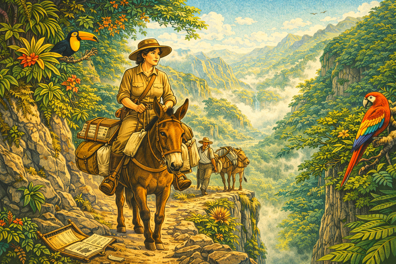 Please generate a 16:9 image in an Art Deco naturalist style depicting Panel 5 using a bright high-contrast pallet of colors. The scene shows Ynes Mexia riding a mule along a narrow mountain trail in the Sierra Madre of western Mexico, circa 1926. She wears practical field clothing, a wide hat, and carries a botanical press strapped to the mule's pack saddle alongside canvas bags bulging with specimens. Behind her, a local Indigenous guide leads a second pack mule loaded with camping gear. The trail winds along the edge of a deep canyon filled with tropical forest — bromeliads and orchids cling to cliff faces. Morning mist rises from the valley below. Birds (toucans, parrots) perch in the canopy. The color palette features rich verdant lush greens, misty blues, warm earth tones, and golden morning light. The emotional tone is adventurous and serene — a woman fully in her element in wild terrain.After recovering from her injuries, Mexia did something that stunned her Berkeley colleagues: she set out alone into the Sierra Madre of western Mexico. With Indigenous guides, pack mules, and her botanical press, she spent months traversing remote canyons and cloud forests that few scientists had ever visited. She collected in Nayarit, Jalisco, and Sinaloa, pressing hundreds of specimens each week and shipping crates back to UC Berkeley. At an age when most people considered retirement, Mexia was just hitting her stride.