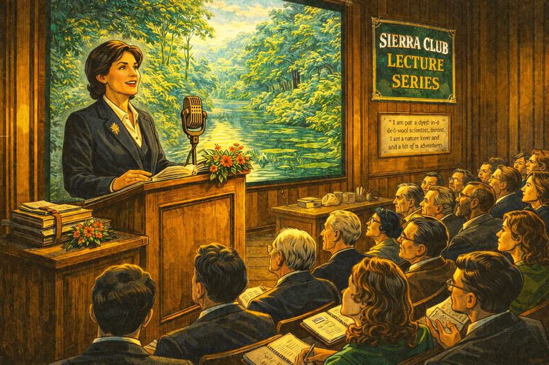 Please generate a 16:9 image in a brightly colored high-contrast Art Deco portrait style depicting Panel 9. The scene shows Ynes Mexia at a podium in a wood-paneled lecture hall at the California Academy of Sciences, circa 1932. She is dressed in a smart dark suit with a botanical pin on her lapel, speaking to a packed audience. Behind her is a large projected photograph of a jungle river scene. On the podium sit her field notebooks and a small bouquet of pressed tropical flowers. The audience includes men and women scientists, students, and Sierra Club members — some lean forward with interest, others take notes. A banner reads "Sierra Club Lecture Series." On the wall beside the projection, a framed quote reads: "I am not a dyed-in-the-wool scientist. I am a nature lover and a bit of an adventuress." The color palette features rich wood tones, warm stage lighting, dark formal clothing, and the vivid green of the projected jungle image. The emotional tone is confidence and connection — a woman sharing her passion with the world. Make the microphone look like it was in the 1930s. Use a old-style radio microphone.Mexia became a beloved figure in California's scientific community, giving lectures at the California Academy of Sciences, the Sierra Club, and botanical societies. She described herself with characteristic humility: "I am not a dyed-in-the-wool scientist. I am a nature lover and a bit of an adventuress." But her audiences knew better — her meticulous specimen preparation, detailed field notes, and sheer volume of discoveries placed her among the most productive botanists of the twentieth century. She proved that passion and perseverance matter more than pedigree.