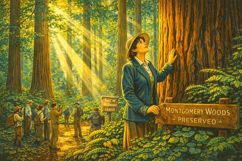 Please generate a 16:9 image in a brightly colored high-contrast Art Deco / California Impressionist style depicting Panel 10. The scene shows Ynes Mexia standing among towering coast redwood trees in a northern California grove, circa 1933. Shafts of golden light pierce the canopy high above, illuminating ferns and sorrel on the forest floor. She places her hand on the bark of an enormous redwood trunk, looking upward with reverence. Beside her, a wooden sign reads "Montgomery Woods — Preserved." A Sierra Club hiking group gathers nearby, some taking photographs, others examining the understory plants Mexia has pointed out. A "Save the Redwoods League" banner is visible on a trail post. The color palette features deep redwood browns, verdant emerald greens, golden light shafts, and forest-floor amber. The emotional tone is reverence and purpose — a scientist who fights to protect what she studies.Mexia was not content merely to collect and classify — she fought to protect the ecosystems she studied. As an active member of the Sierra Club and the Save the Redwoods League, she advocated fiercely for preserving California's ancient redwood forests and wild places. She understood that biodiversity was fragile, that the same forests yielding new species could be logged to nothing within a generation. A redwood grove at Montgomery Woods State Natural Reserve in Mendocino County was later named in her honor — a living monument to a woman who saw conservation and science as inseparable.