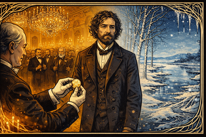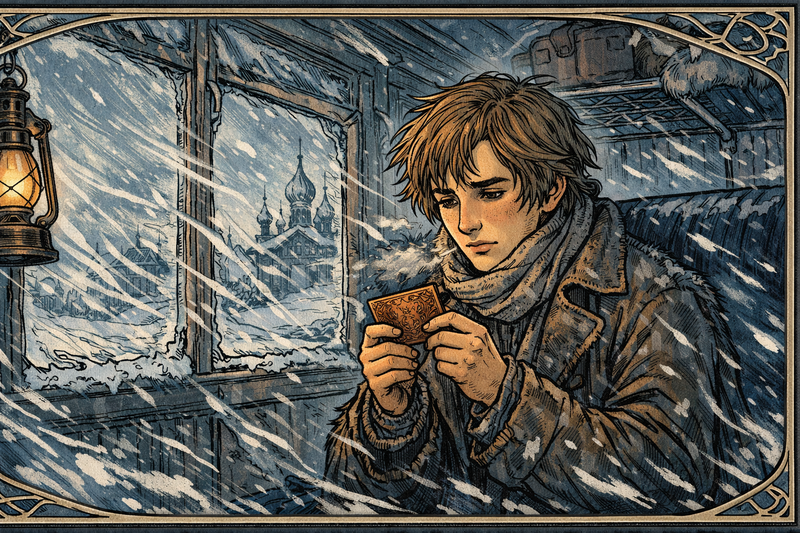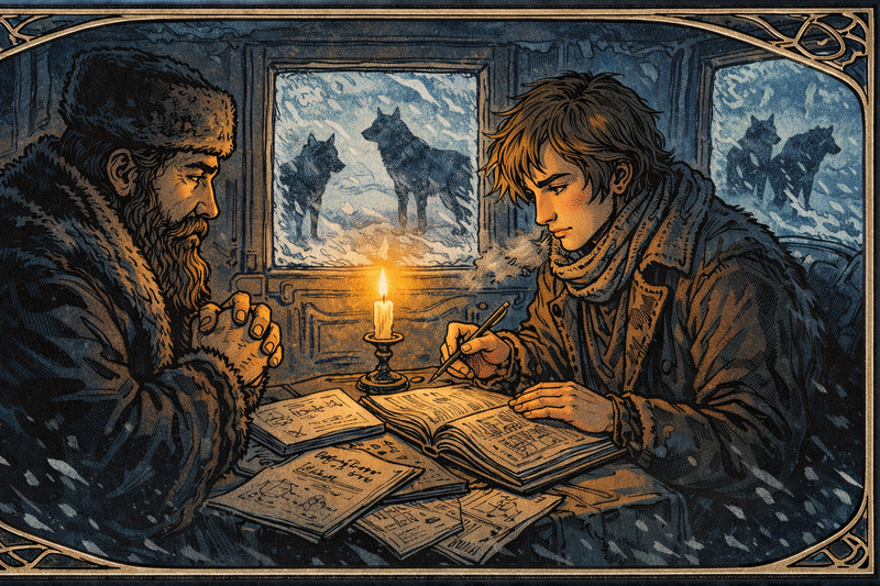 The journey nearly fails before it begins. Timbers crack, wolves howl, and Dmitri spends nights tutoring fellow passengers just to pay for bread. Between lessons he sketches laboratory glassware he has only seen in books. Each new friend signs his card like a passport, proof that knowledge can cross the Urals even when money cannot.