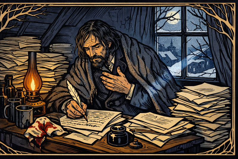 Please generate a new image. Image Format: Create a wide-landscape 16:9 width:height ratio frame. Drawing Style: Use graphic-novel drawing using Art Nouveau linework. The image shows a cramped, cold attic room in St. Petersburg in deep winter. Dmitri Mendeleev, now in his late 20s with sunken cheeks showing illness, sits hunched at a small writing desk buried under stacked manuscript pages. He wears a heavy overcoat pulled over his nightclothes with an ink-stained woolen blanket draped over his shoulders for warmth. A bloodstained handkerchief lies crumpled beside his inkwell. He grips a quill pen, caught mid-sentence — one hand pressed to his chest mid-cough, the other still pressing the pen to the page. Several dark medicine bottles and a tin cup of cold tea crowd one corner of the desk. A cracked single window admits cold moonlight as a blue-white shaft across the manuscript pages. A nearly-spent gas lamp provides warm amber glow from the other side. Art Nouveau bare winter branch motifs are woven into the window frame design. Color palette: deep indigo shadow, ivory manuscript pages, amber lamp glow, crimson accent. Mood: grim, exhausted determination.Chapter 4 – Academy Without Apparatus