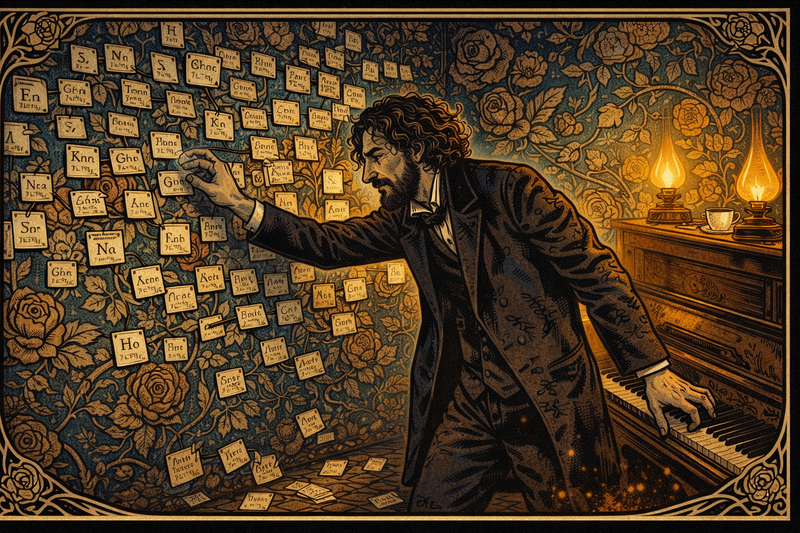 Preparing a new general chemistry text, Dmitri scribbles element data on index cards and pins them to floral wallpaper. The cards refuse to align. He rearranges them overnight, eyelids gritty. To stay awake he plays piano scales with one hand while moving cards with the other, turning his study into a musical lab.