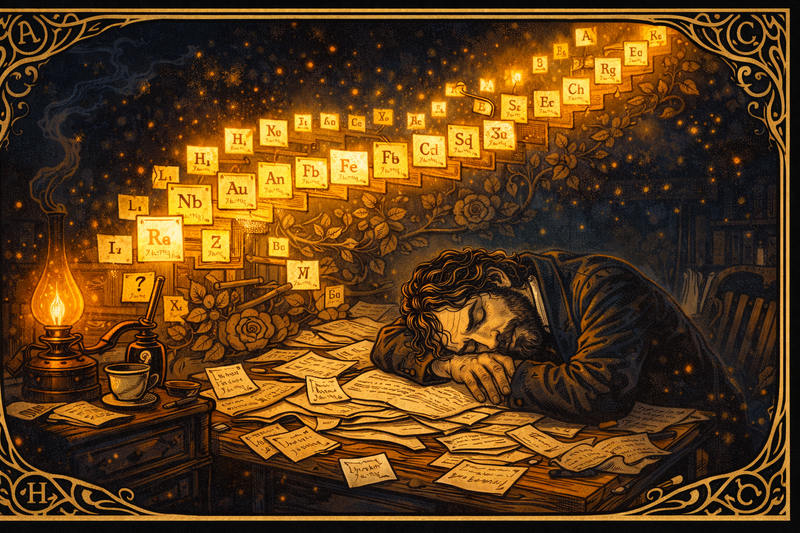 Exhausted, he collapses at his desk and dreams the cards fall into neat staircases. Waking with a gasp, he sketches the periodic table in minutes. “In this pattern, elements with similar souls stand together,” he writes, leaving blank spaces labeled “eka-boron,” “eka-aluminum,” daring future chemists to find them.