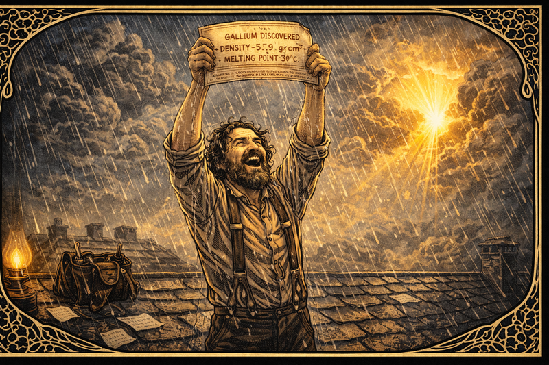 Years later gallium is discovered with the exact density and melting point he predicted for eka-aluminum. Dmitri receives the telegram while repairing a leaking roof. He laughs, rain soaking his beard, and holds the paper to the sky: “Welcome, little metal! Tell them there are more of you coming.” Skeptics fall silent.
