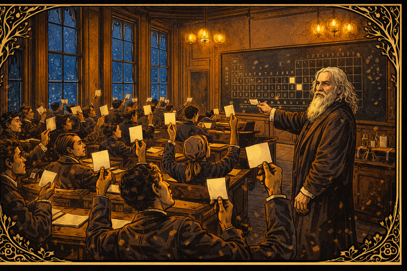 In his final lectures he lays a blank card on each student’s desk. “Someday you will write the name of an element or idea that does not yet exist.” As snow falls outside, Dmitri’s beard gleams white, but his eyes sparkle cobalt. He has shown that absence itself can be evidence, that patience can be predictive.