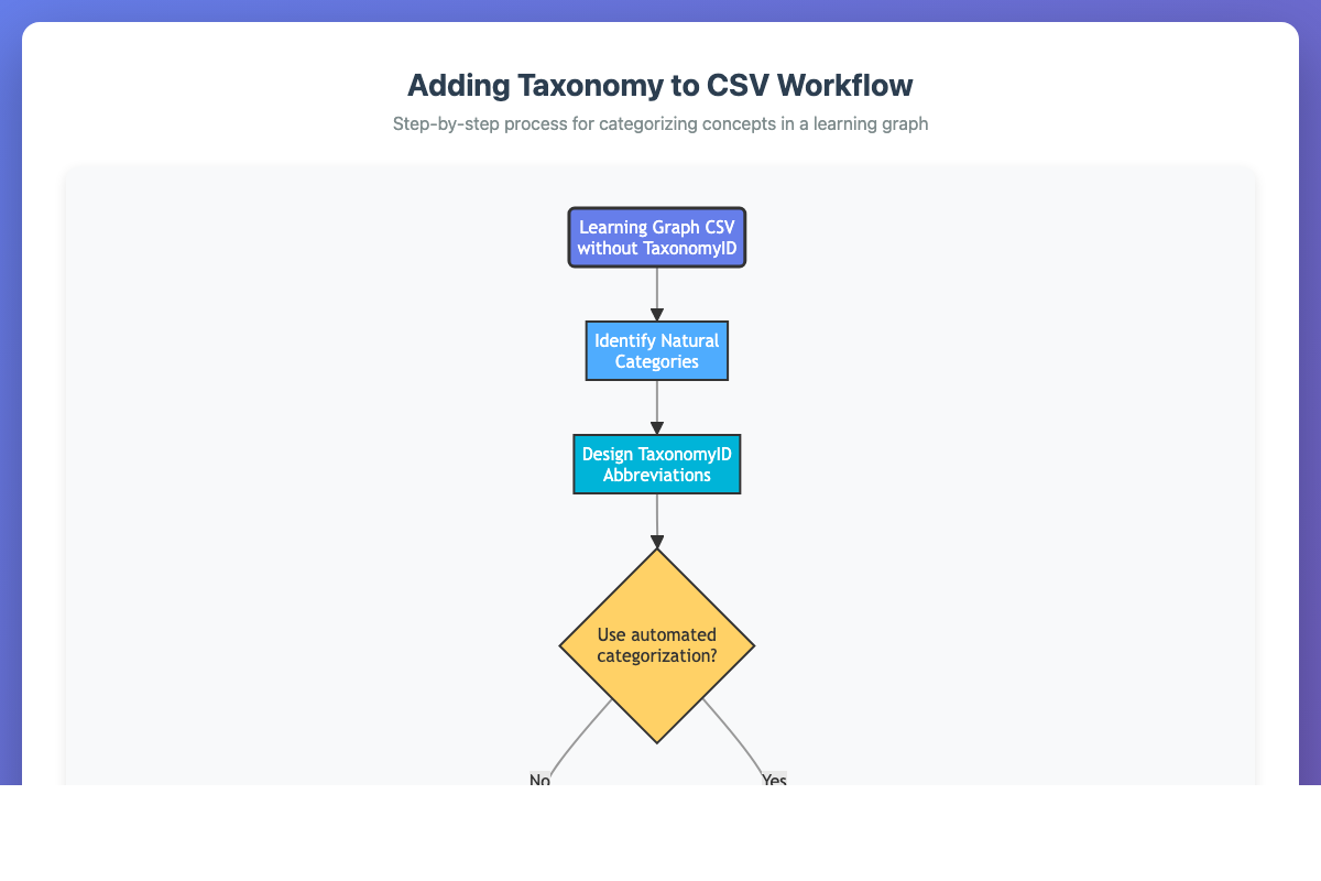 Interactive Mermaid visualization showing the complete workflow for adding taxonomy categorization to a learning graph CSV file.