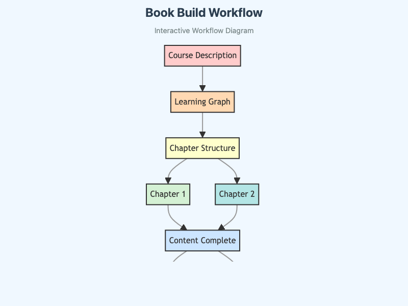 Interactive workflow diagram illustrating the complete process for building an intelligent textbook from course description through final metrics.