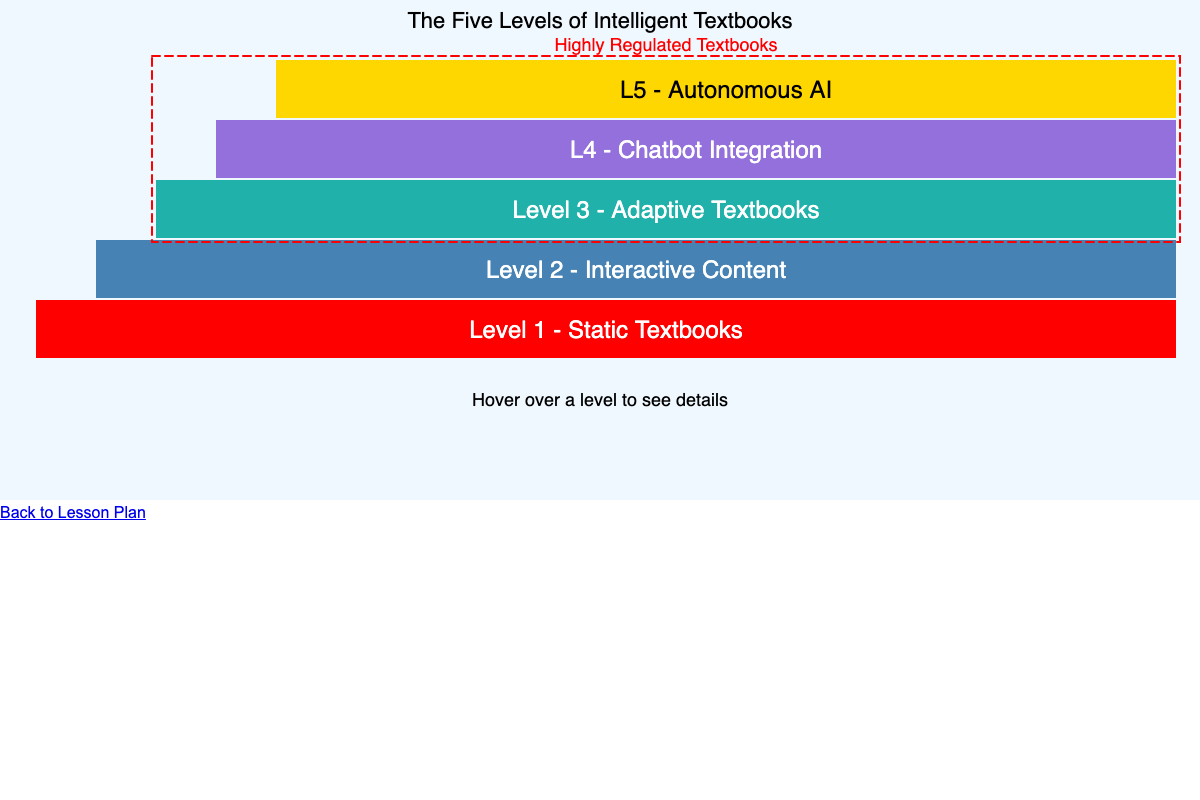 Interactive p5.js visualization showing the five levels of intelligent textbooks from static to autonomous AI.