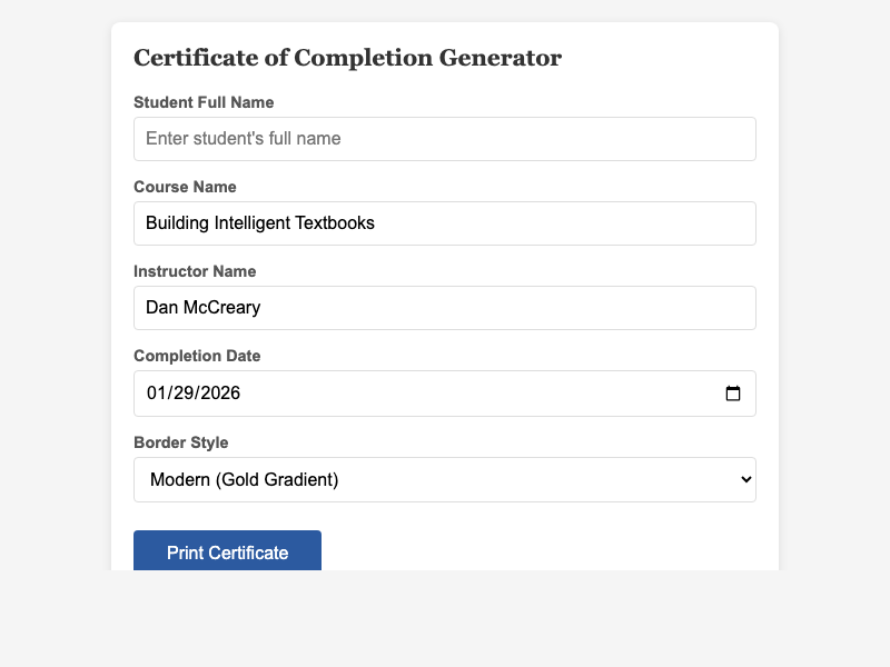 Interactive tool to generate and print professional certificates of completion for course graduates.