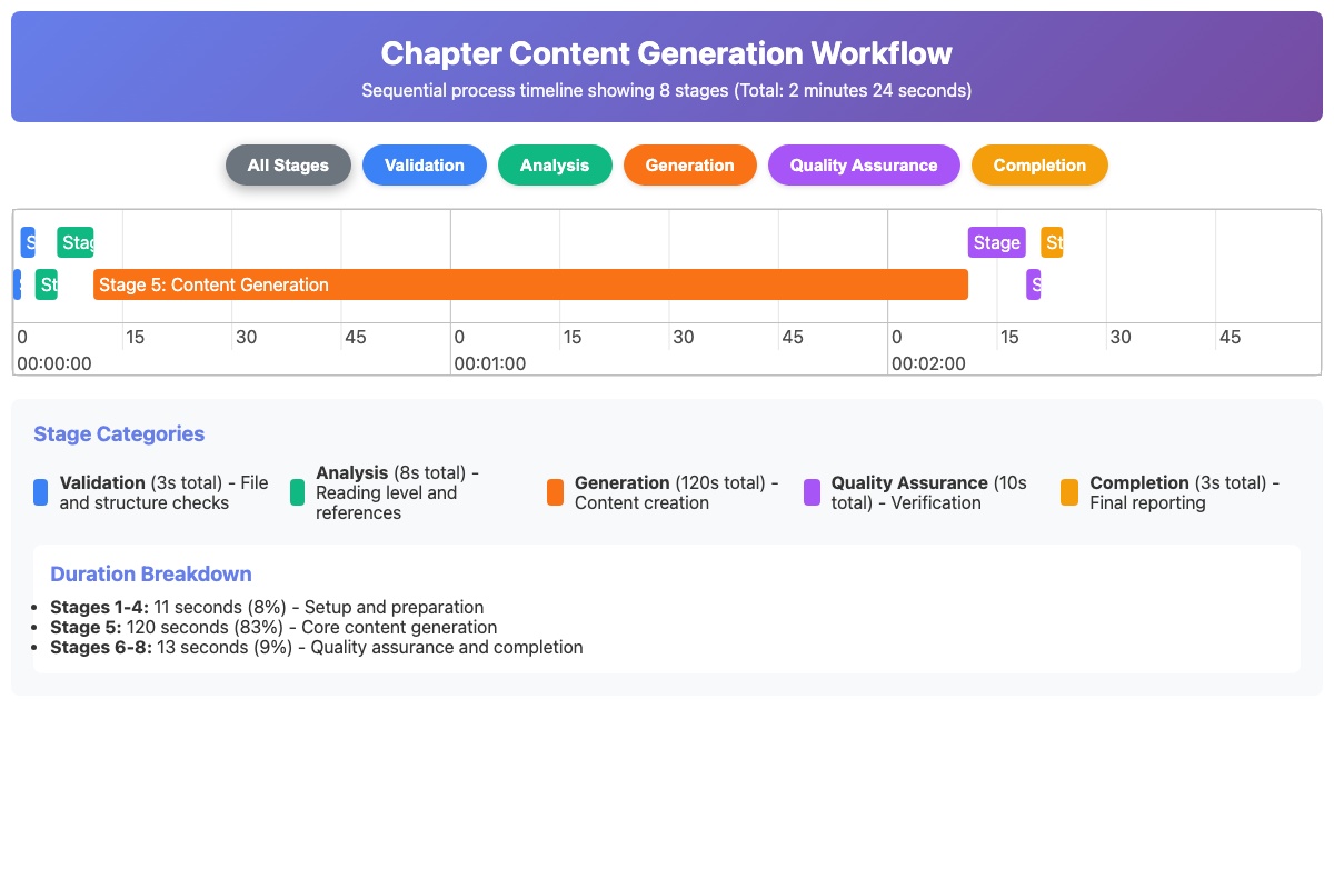 Interactive timeline showing the 8 sequential stages of chapter content generation from validation through reporting.