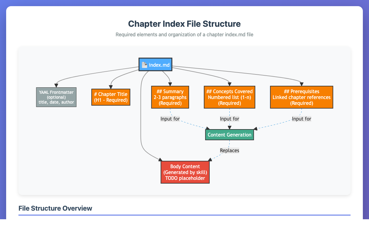 Mermaid diagram showing the structure of a chapter index.md file including YAML frontmatter and required sections.
