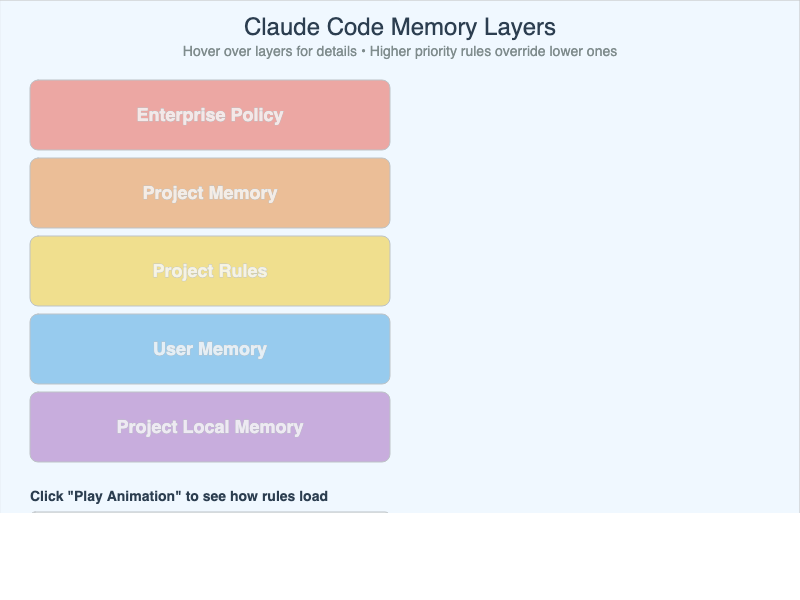 Interactive infographic showing the five memory layers in Claude Code and how higher-priority rules override lower-priority ones.