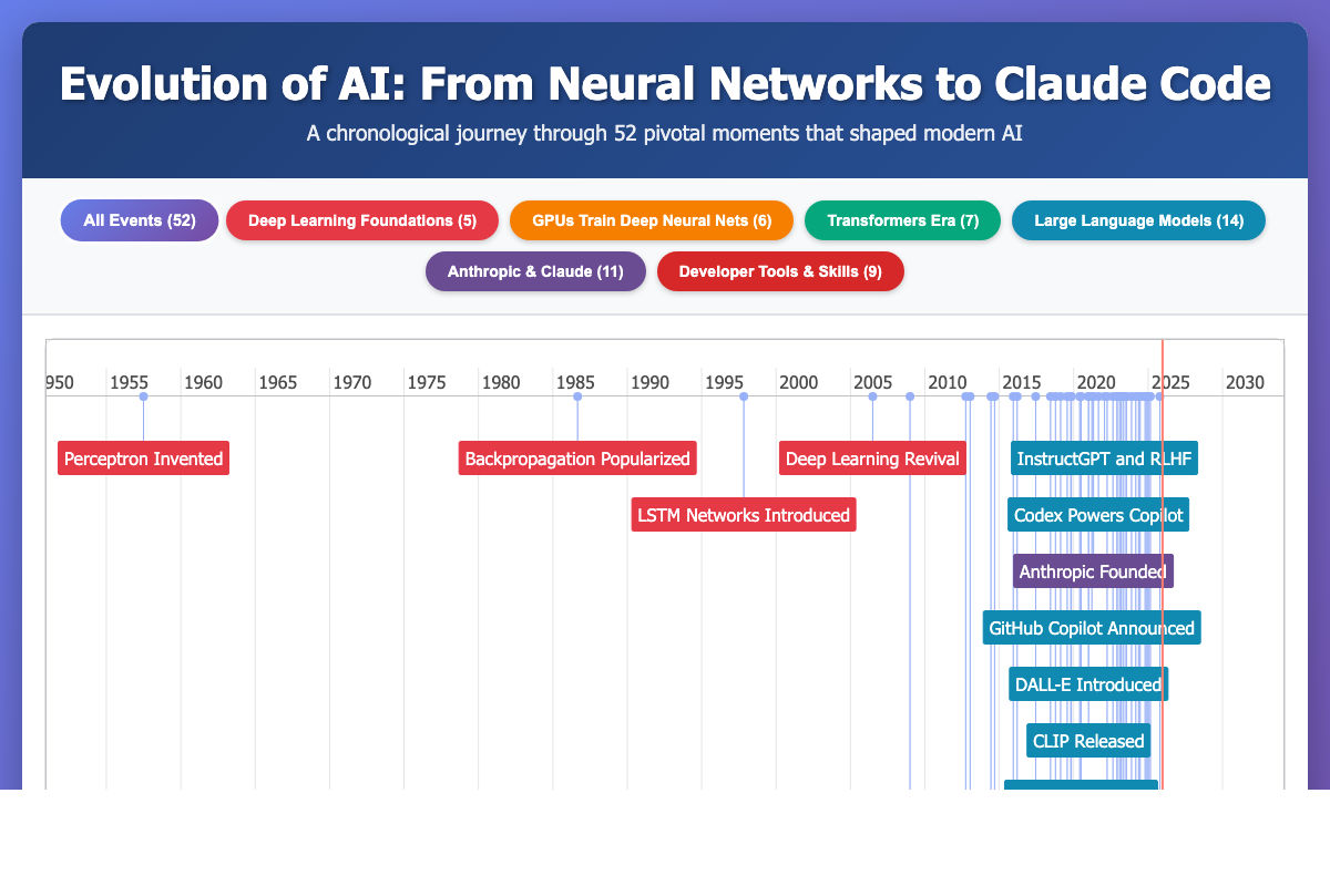 Interactive timeline chronicling 52 pivotal moments in AI history from the Perceptron in 1957 to Claude Skills in 2025.