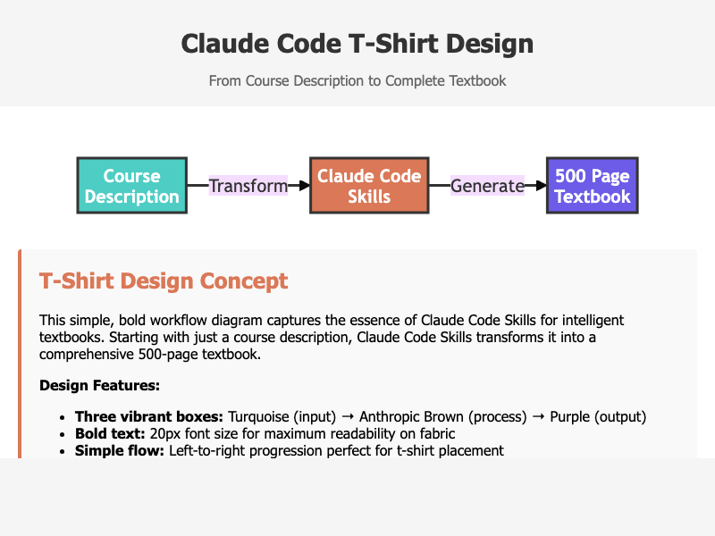 T-shirt design showcasing the workflow from course description to 500-page textbook using Claude Code Skills.