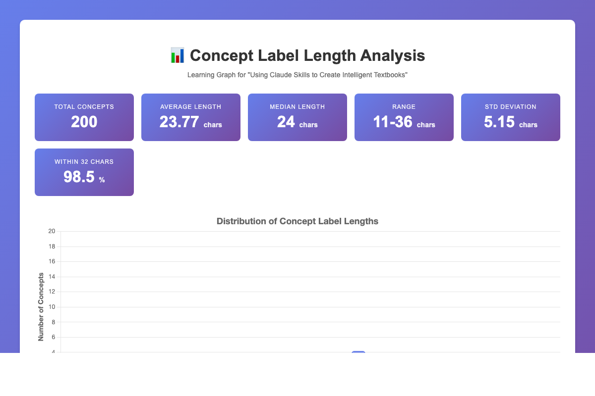 Interactive Chart.js visualization analyzing the length distribution of all 200 concept labels in the learning graph.