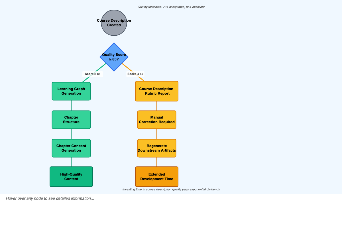 Interactive p5.js workflow diagram showing how course description quality has exponential impacts on textbook generation.