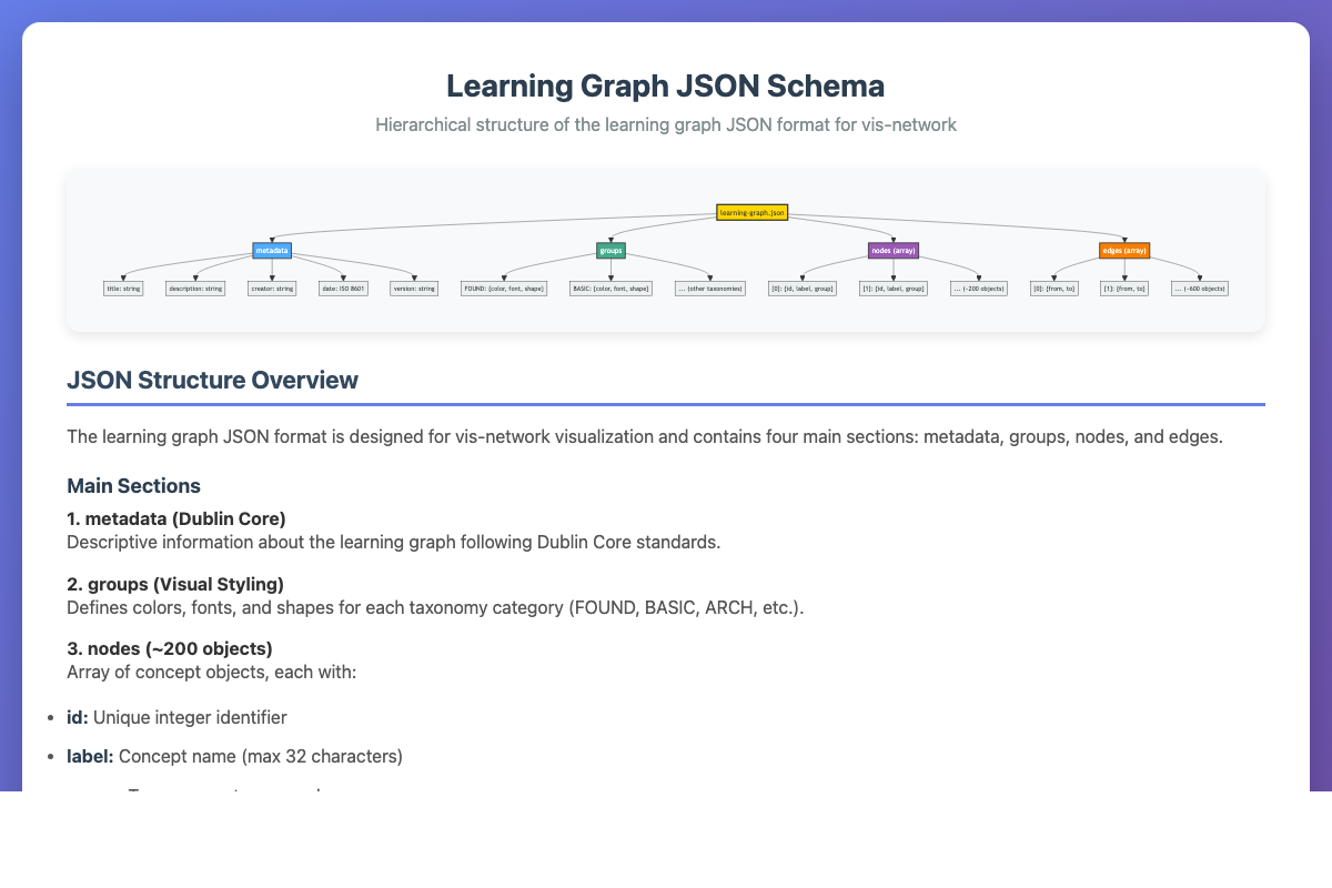 Mermaid tree diagram showing the structure of the learning graph JSON format for vis-network visualization.