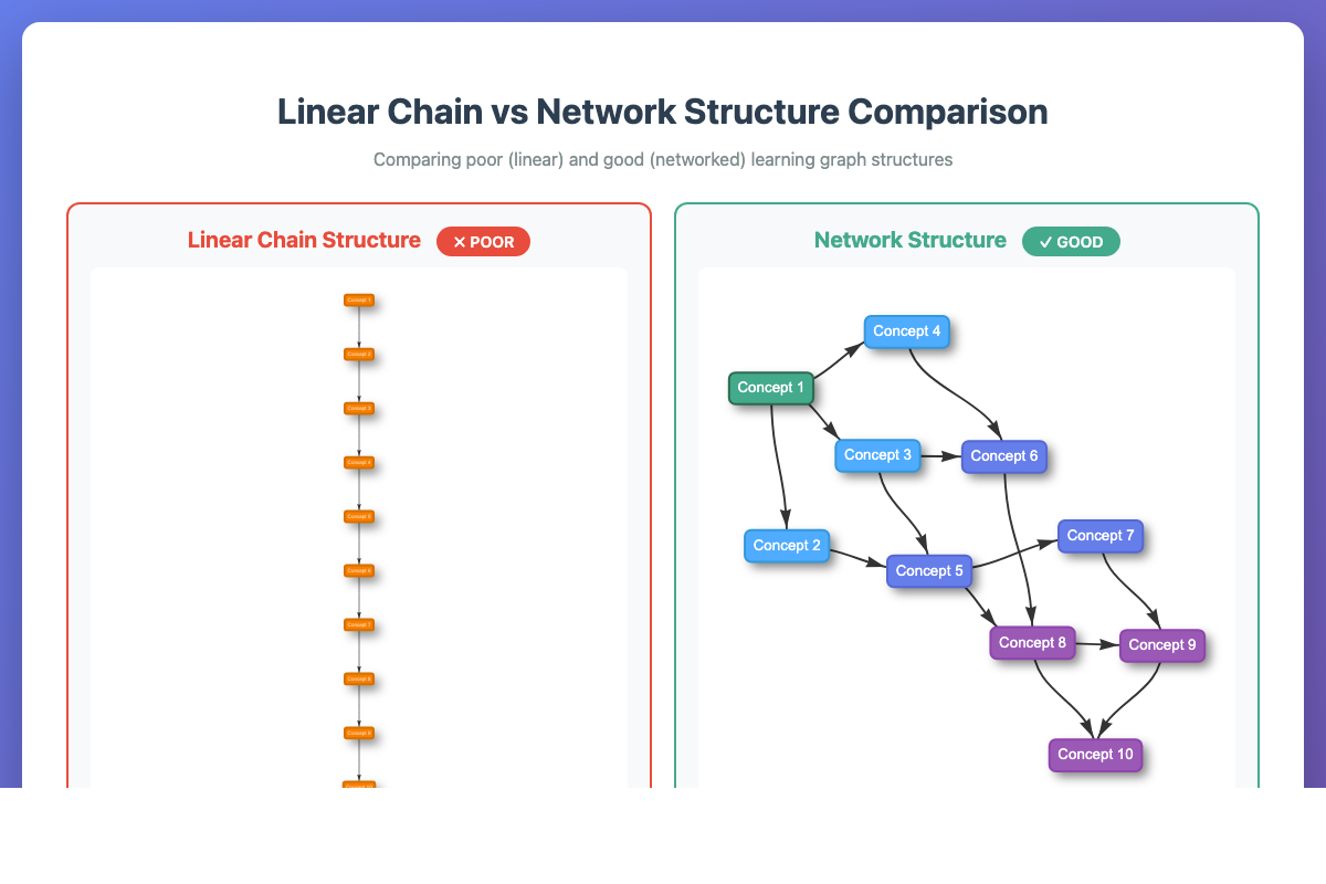 Side-by-side comparison of poor (linear chain) and good (networked) learning graph structures.