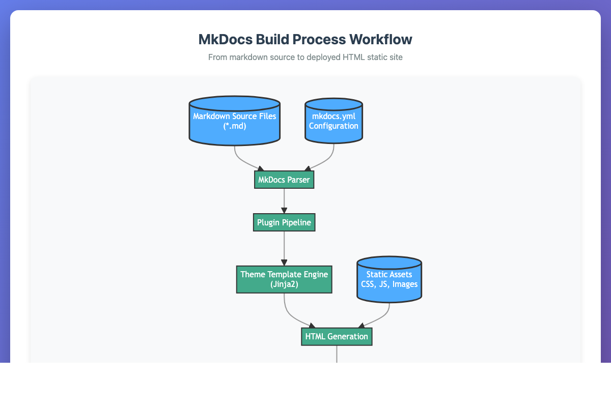 Mermaid diagram showing the complete MkDocs build pipeline from markdown source to generated HTML.