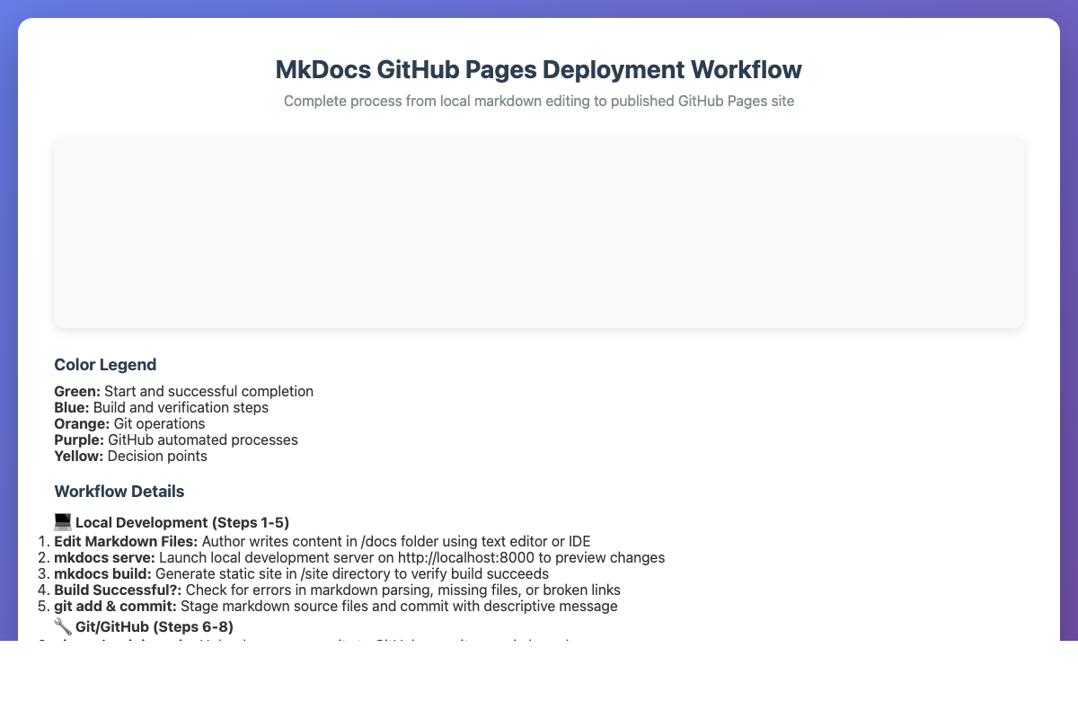 Interactive diagram showing the complete workflow from local markdown editing to published GitHub Pages site.