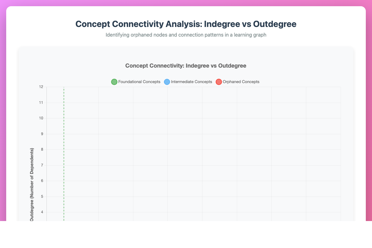 Interactive scatter plot visualizing concept connectivity patterns to identify foundational and orphaned concepts.
