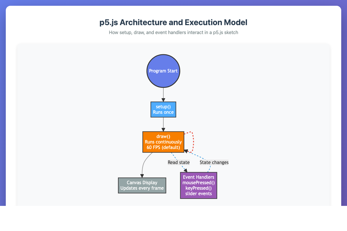 Mermaid diagram illustrating the p5.js setup(), draw() loop, and event handler execution model.
