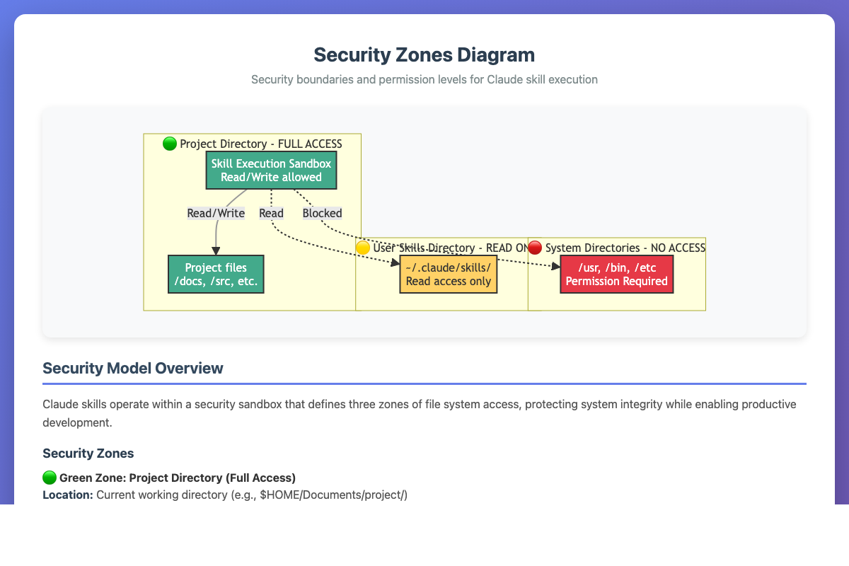 Mermaid diagram showing the three concentric security zones in the Claude skills architecture.