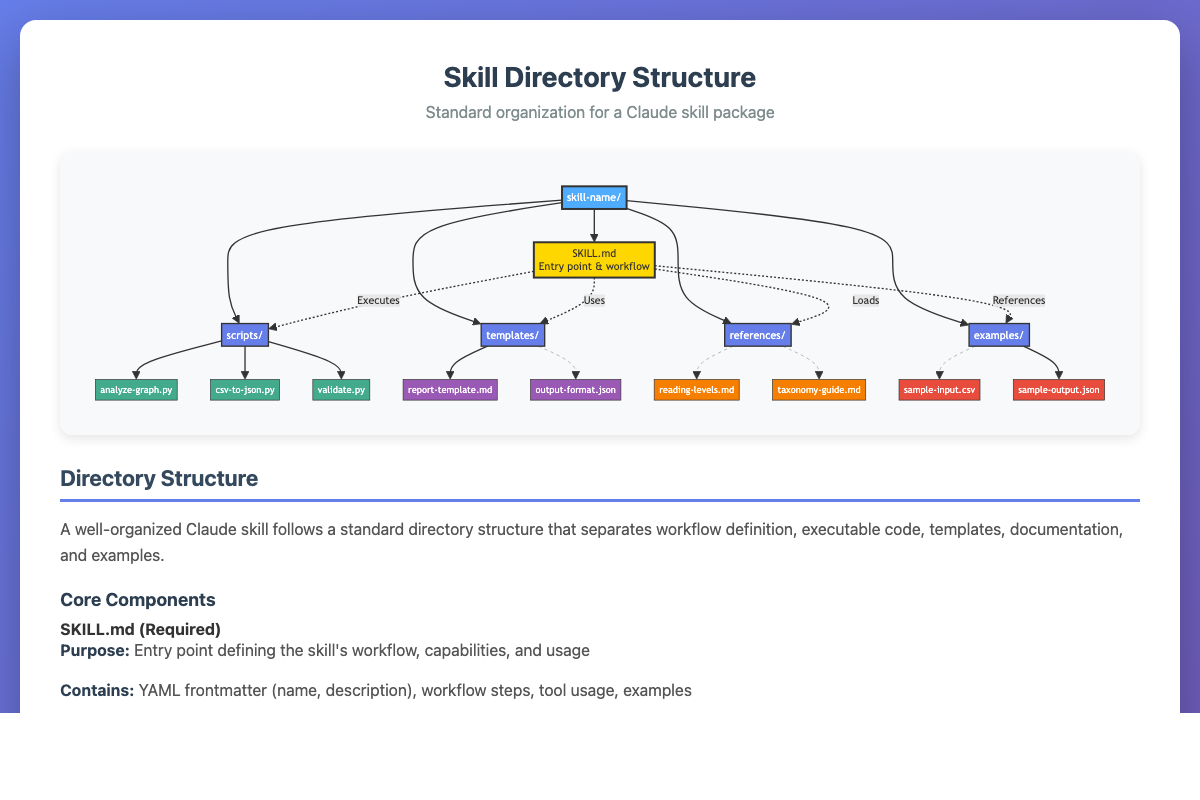 Mermaid file tree diagram showing the standard directory structure for Claude skills.