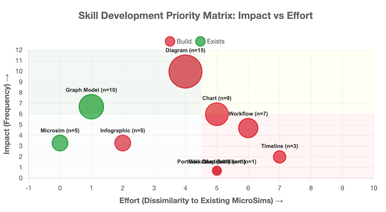 Interactive bubble chart visualizing priority matrix for skill development based on impact versus effort.