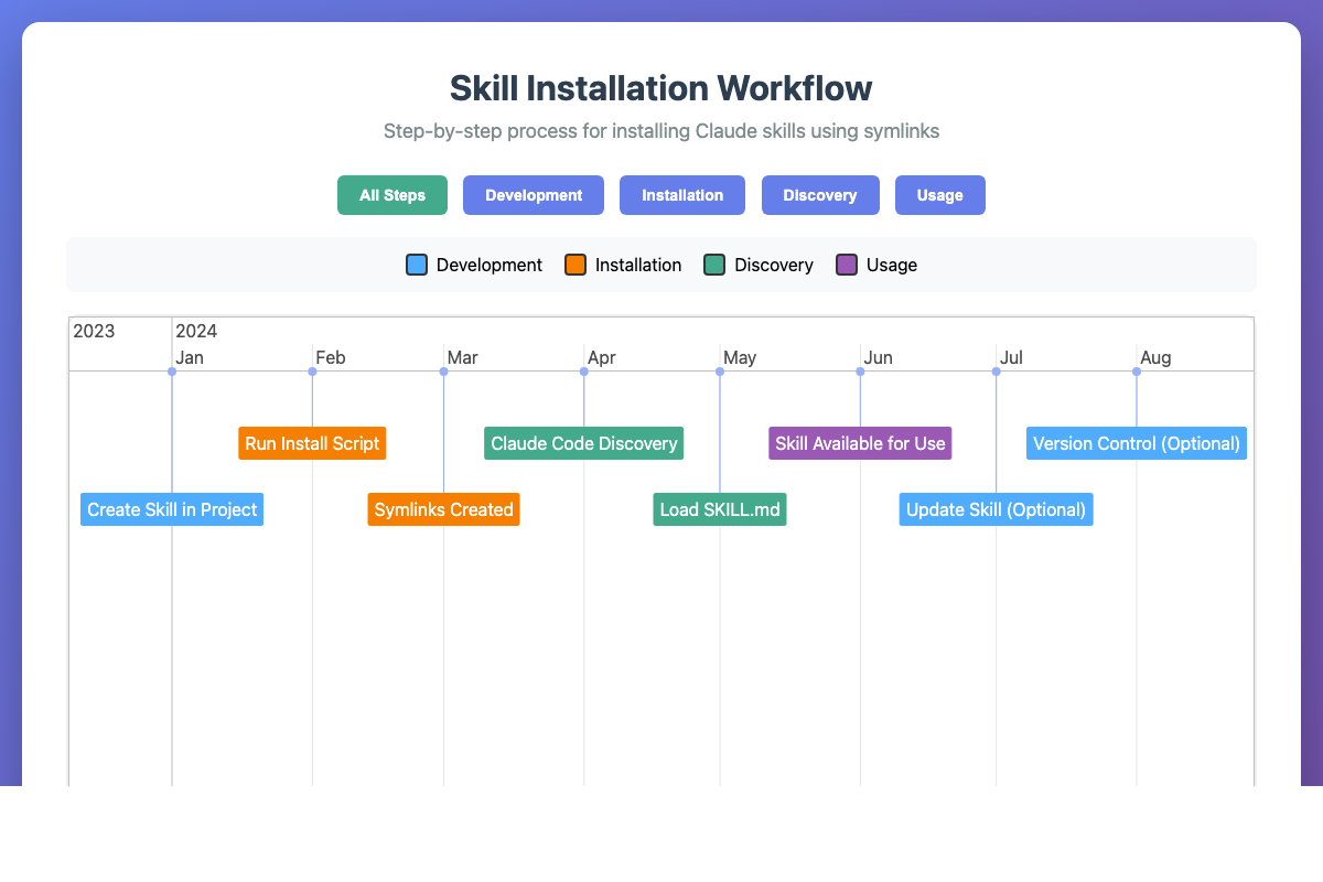 Interactive timeline showing the step-by-step process for installing Claude skills using symlinks.