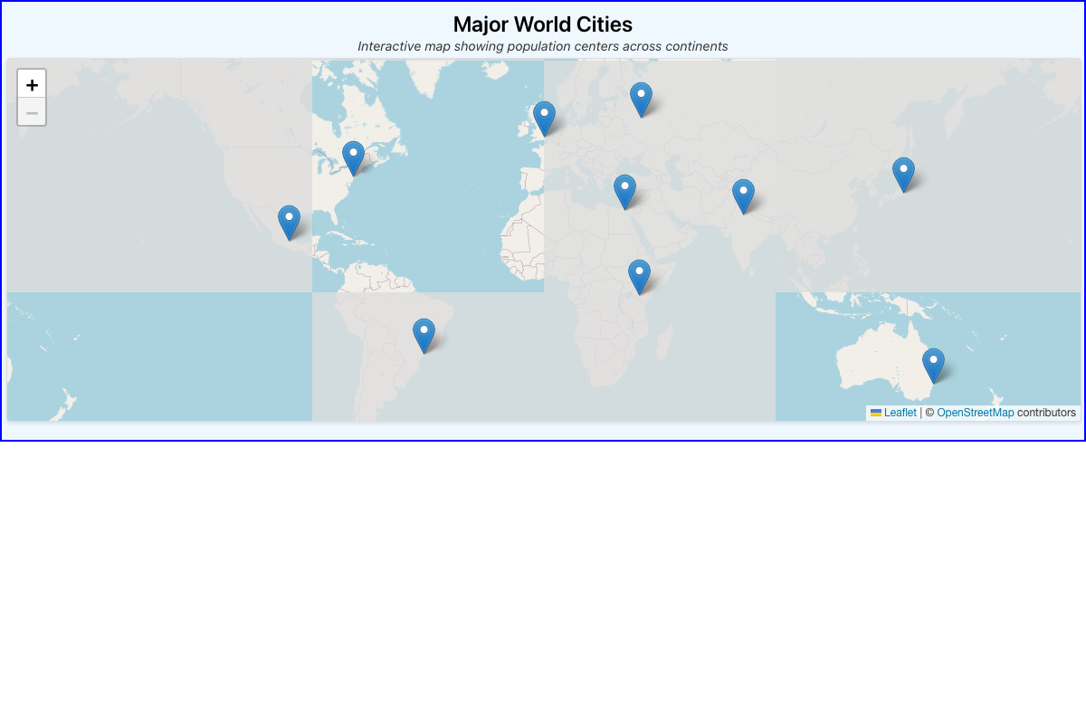 Interactive Leaflet map showcasing ten major cities across different continents with click-to-view details.