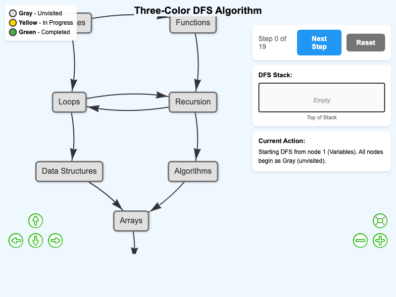 Interactive vis-network visualization demonstrating the three-color DFS algorithm for detecting cycles in learning graphs.