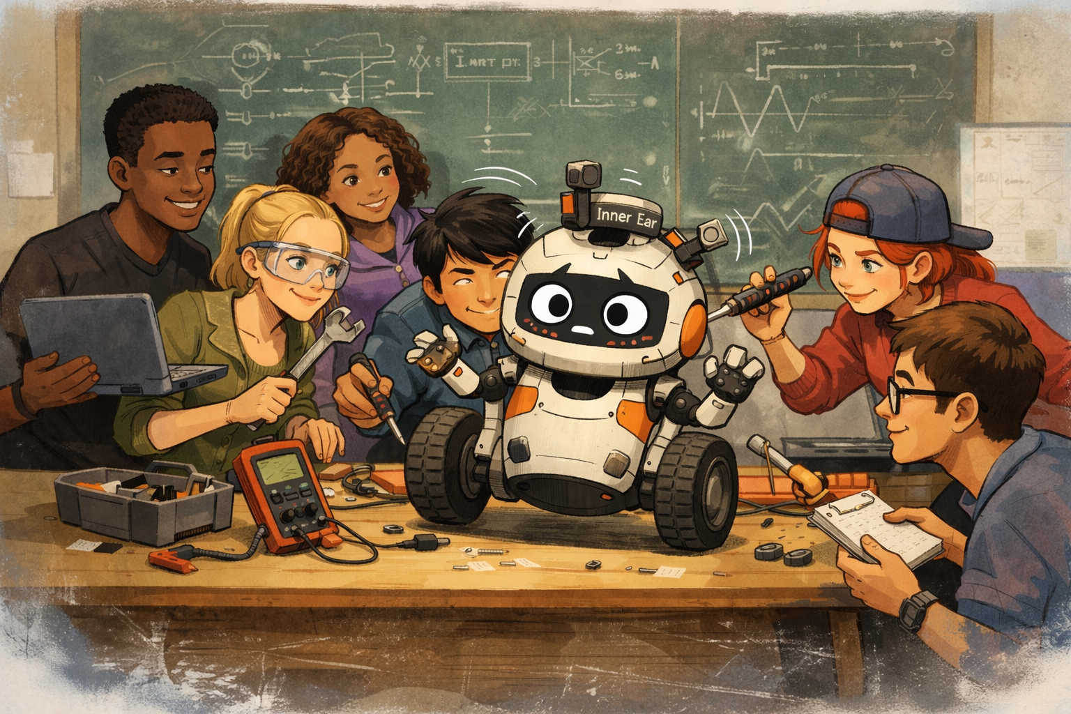 Generate a wide landscape image of junior high school kids playing with the MIP two-wheel self-balancing robot. Make the image 1.91:1 w/h ratio and make it 1200 pixels wide. The kids are in a brightly lit school with fun robotics parts around the room. The kids are smiling and laughing and having a great time. The kids are from a diverse gender and race profile.Consider the MIP robot—that delightful little self-balancing toy that zooms around on two wheels like a tiny, determined penguin. MIP (Mobile Inverted Pendulum) looks simple: just a round body perched on two wheels. But here's the thing—balancing on two wheels is really hard. Try standing a broomstick on your palm. Now imagine doing that while the broomstick is also trying to drive somewhere. That's MIP's life, every millisecond of every day.