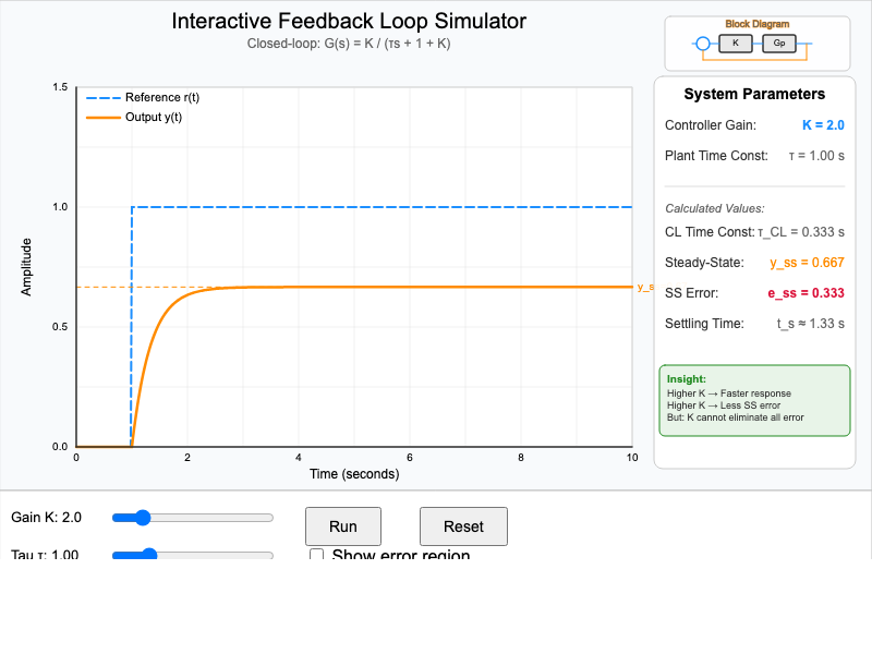 Explore how controller gain K and plant time constant τ affect closed-loop step response, steady-state error, and settling time.