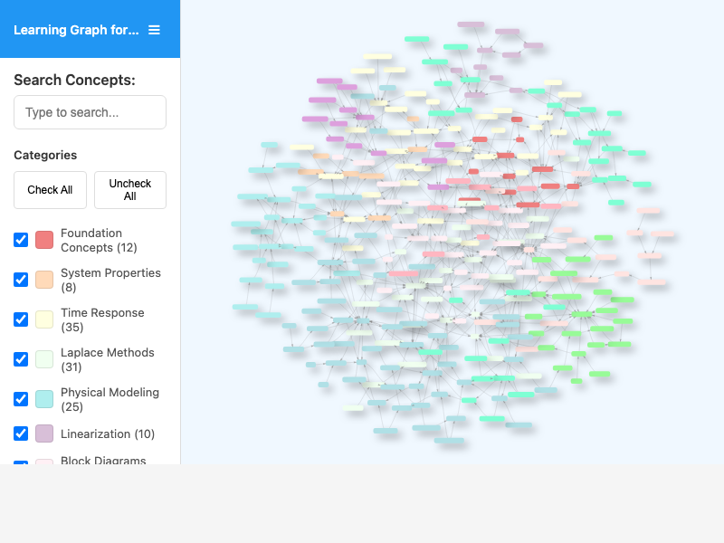 Interactive visualization of the control systems learning graph with search, filtering, and concept exploration features.