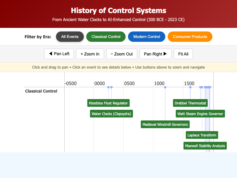 Interactive timeline spanning from ancient water clocks to AI-enhanced control, showing the evolution of control systems across three eras.