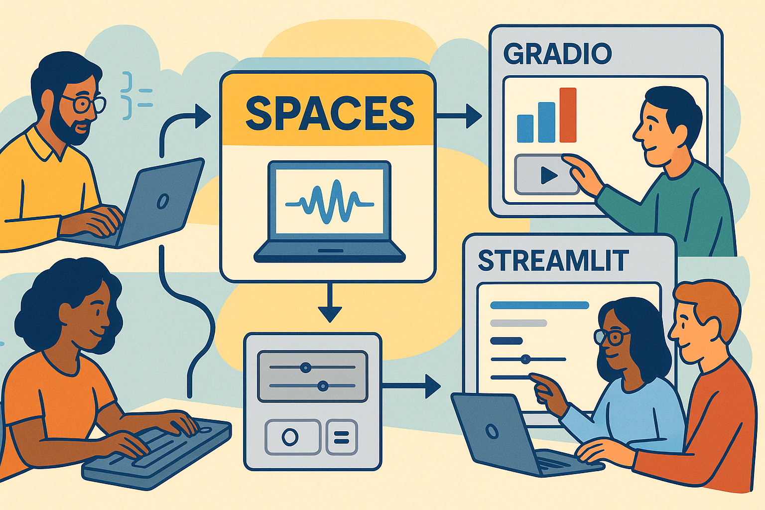 7: A colorful, bright wide-landscape drawing showing the HuggingFace tools ecosystem as an interconnected set of platforms. Central to this should be a visualization of Spaces (showing live demo environments), connected to Gradio and Streamlit interfaces (depicted as intuitive control panels). Show diverse users easily deploying complex AI models with simple interfaces, with minimal coding visible. The scene should convey how technical complexity is being hidden behind user-friendly tools, with arrows connecting the various components of the ecosystem.With the integration of Gradio and Streamlit, and the launch of HuggingFace Spaces, they made it possible for anyone to demonstrate their models with interactive web interfaces.