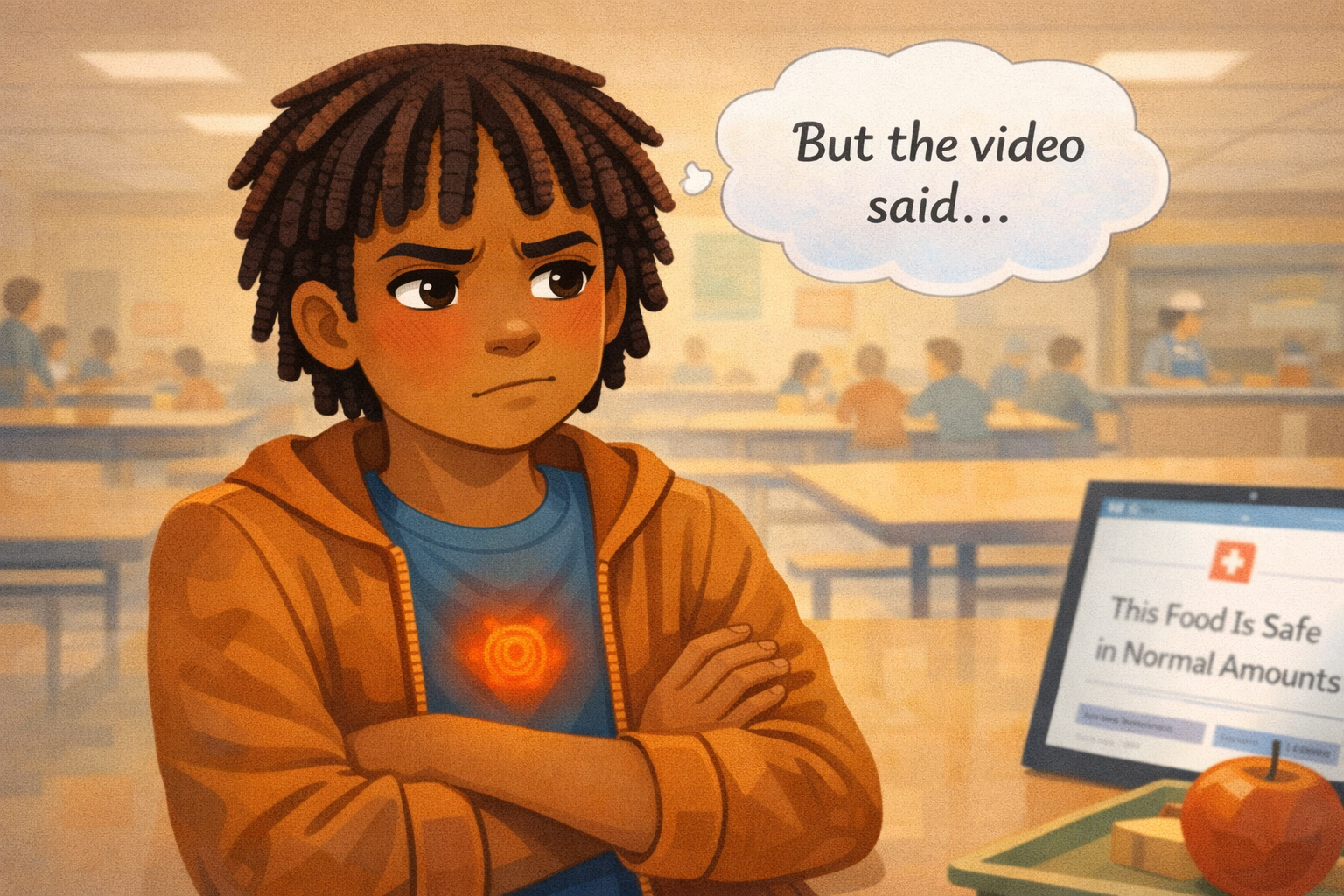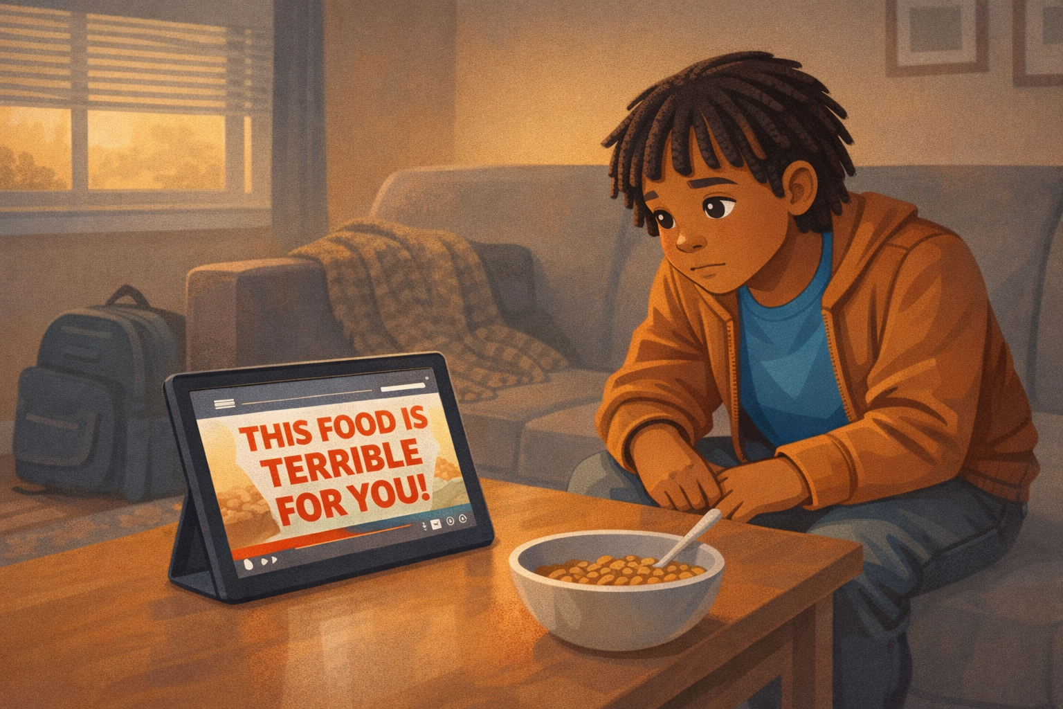 Before school, Jaylen watches a video on his tablet. A loud voice says, "This food is terrible for you! Never eat it again!" The video has dramatic music and flashing text. It feels important and urgent. Jaylen watches the whole thing. By the time he grabs his backpack, he is sure the video is right.