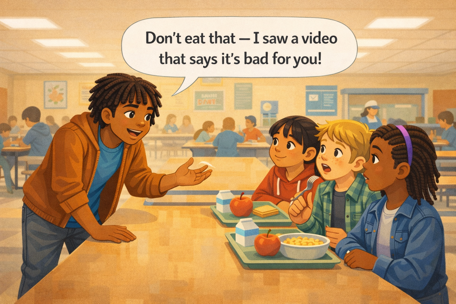 At lunch, Jaylen sees the food on his friend Cole's tray. "Don't eat that!" he says. "I saw a video that says it's really bad for you." He sounds confident. He wants to help. His friends look at their trays, then back at Jaylen. Cole puts his fork down.