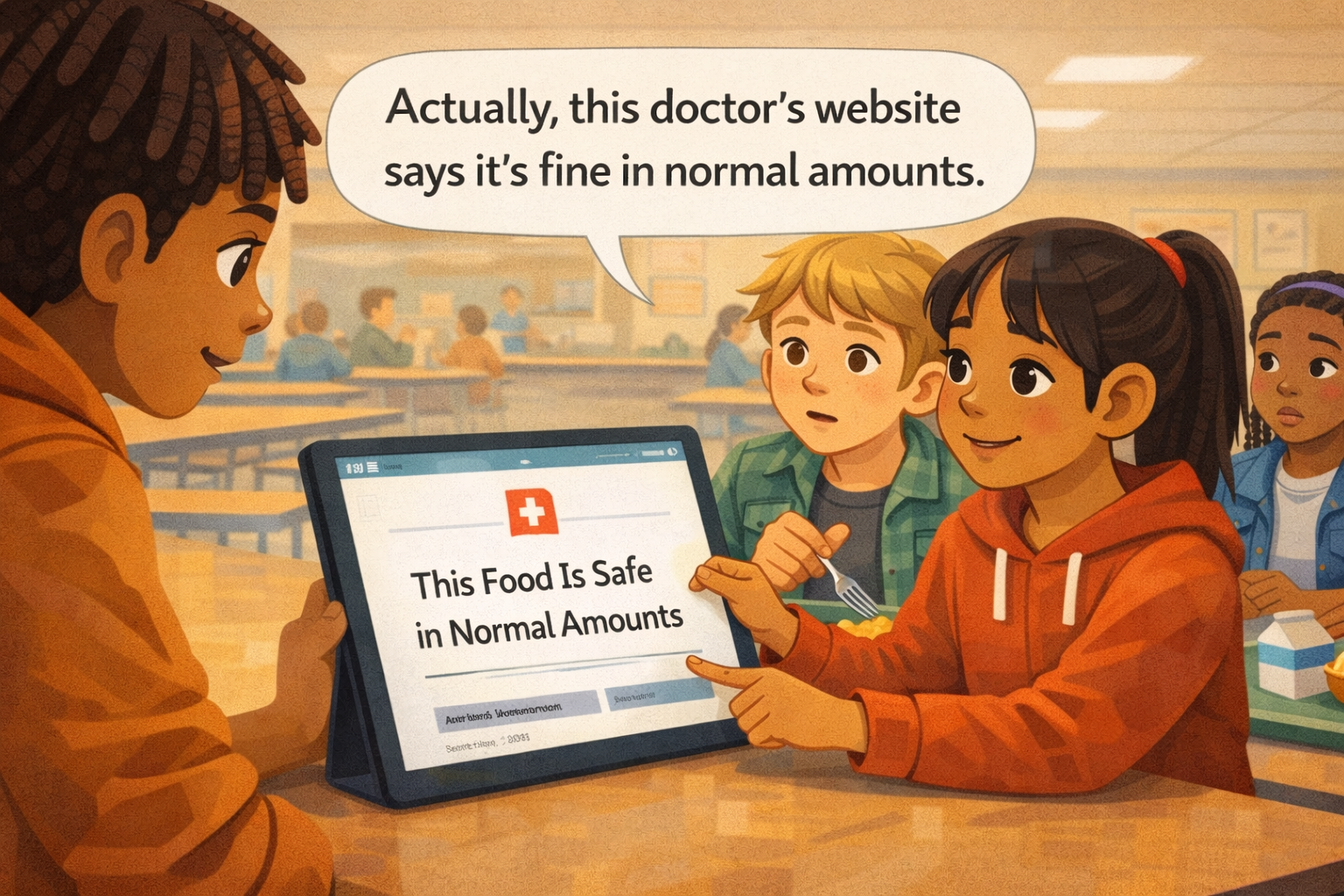 Amara pulls out her tablet. "Actually," she says, "this doctor's website says it's fine in normal amounts." She turns the screen so Jaylen can see. The website is calm and clean. It has a doctor's name, a date, and links to research. It does not have dramatic music or flashing text. It just has information.