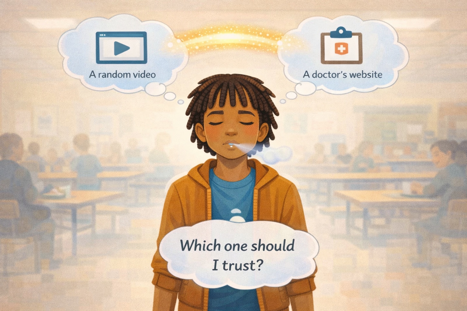 Jaylen closes his eyes for one second. He takes a slow breath. Then he asks himself a quiet question: "Which source should I trust more? A random video with dramatic music? Or a doctor's website with a name and a date and real research?" He already knows the answer. The hard part is saying it out loud.