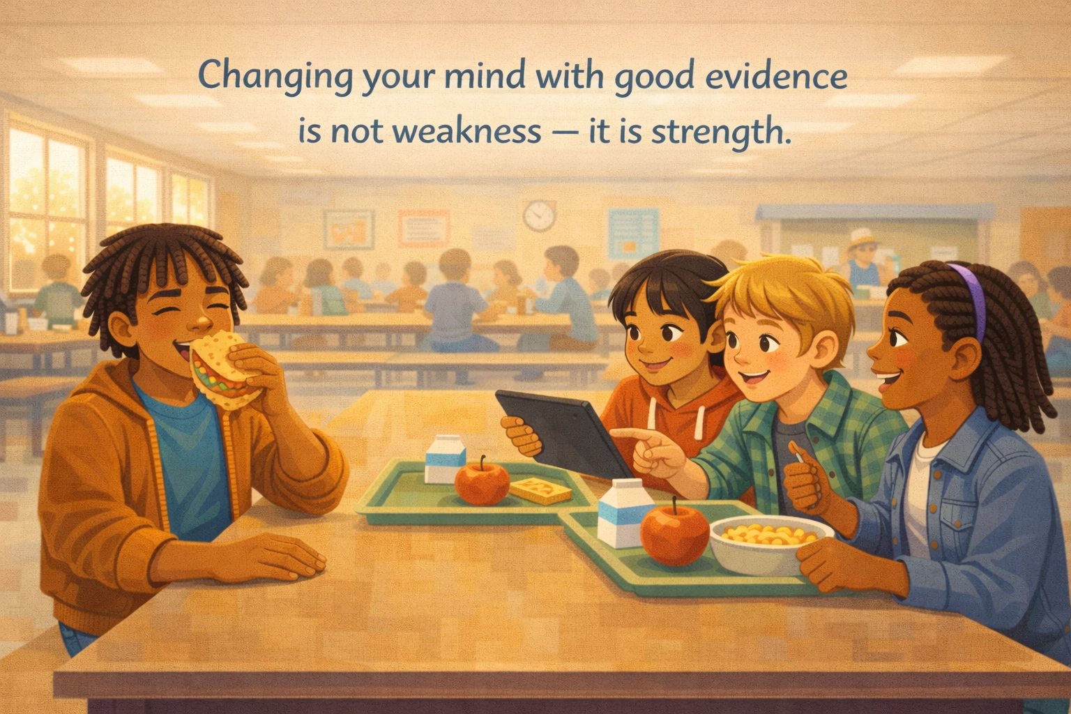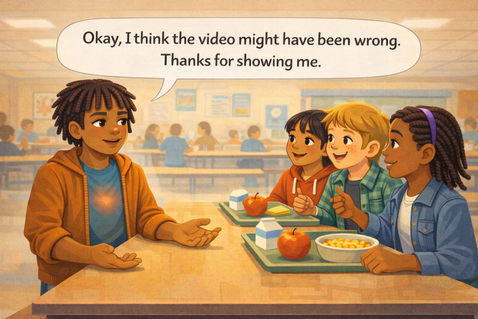 Jaylen opens his eyes and sits down. "Okay," he says. "I think the video might have been wrong. Thanks for showing me that." His voice is steady. He does not feel weak. He feels lighter. Amara smiles. Cole picks up his fork. Nobody laughs at Jaylen. Nobody calls him wrong. They just nod — because changing your mind with good evidence is something to respect.