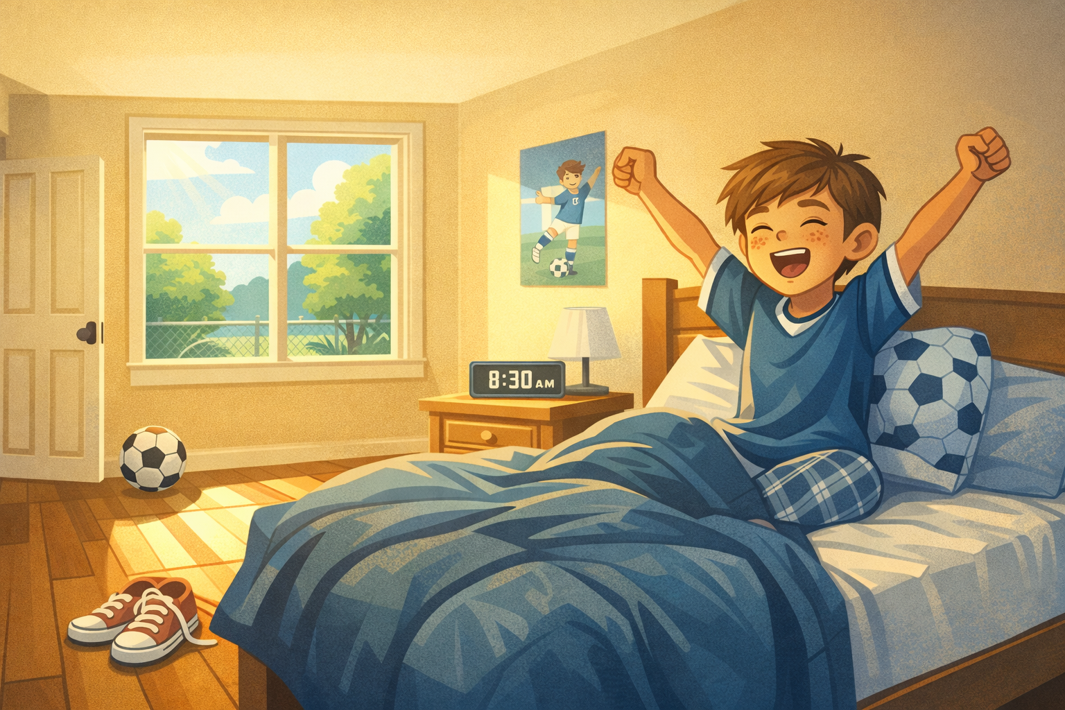 Leo opens his eyes. Sunshine fills his room. It is Saturday morning — the best morning of the whole week. His soccer ball is by the door. His friends are meeting at the field at ten o'clock. He has plenty of time.