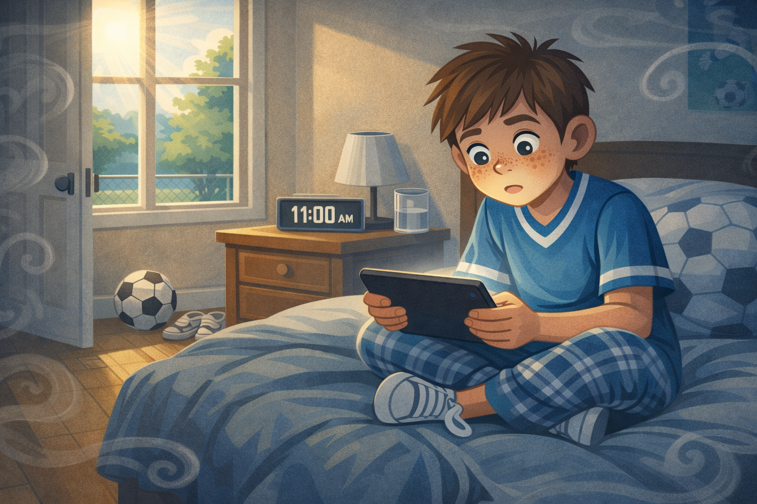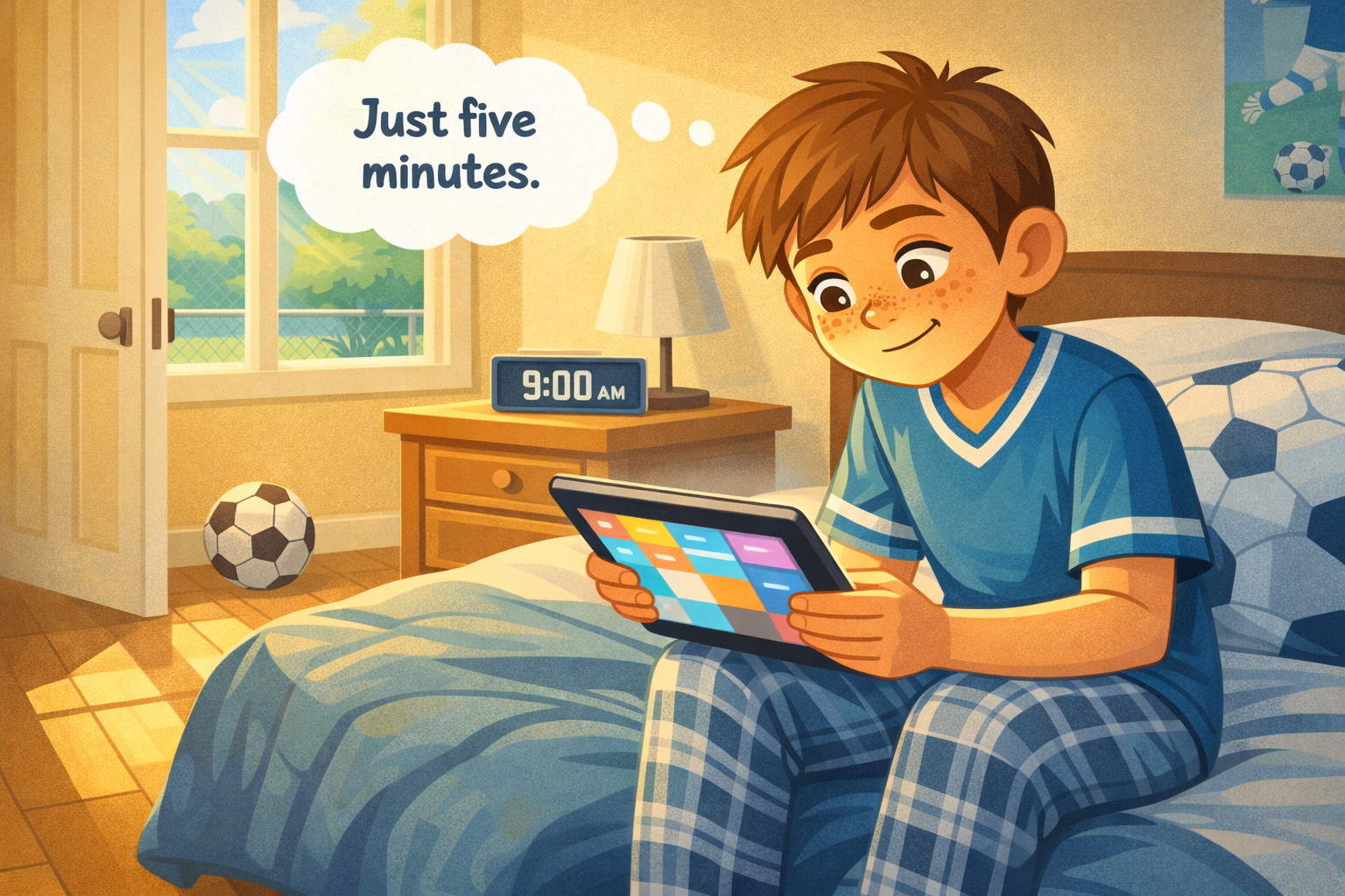 Leo picks up his tablet from the nightstand. "Just five minutes," he thinks. He wants to watch one quick video before he gets dressed. The clock on the nightstand says 9:00 a.m. He has a whole hour before soccer. No rush.