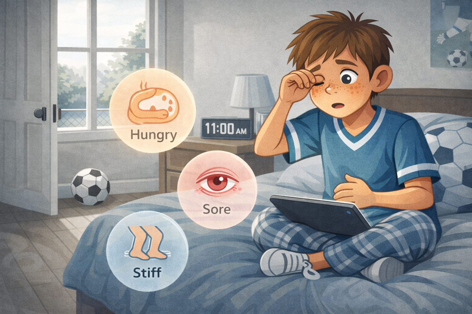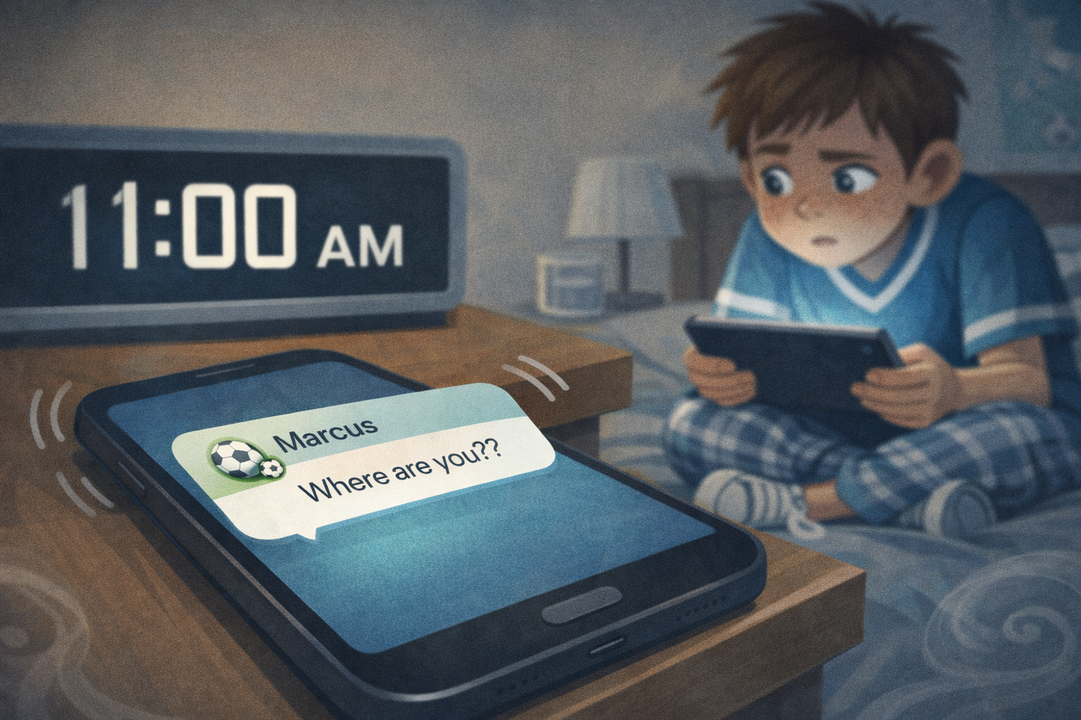 His phone buzzes on the nightstand. Leo glances over. A text from his friend Marcus: "Where are you??" Leo blinks. Soccer. The field. His friends. They have been waiting for him. His stomach drops.