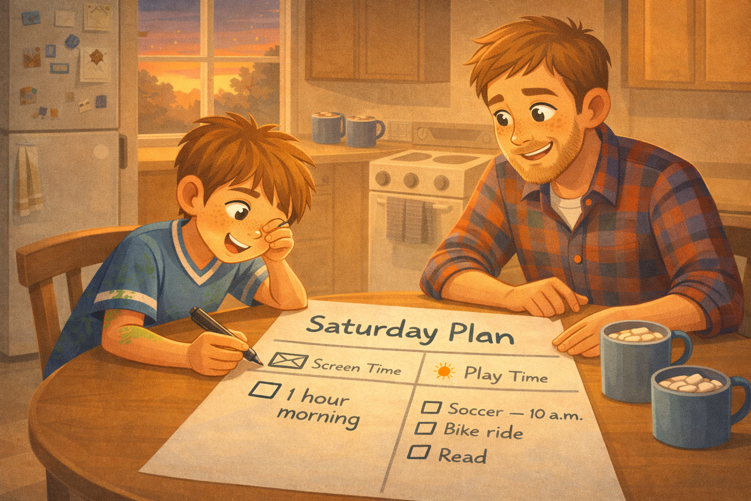 That evening, Leo and his dad sit at the kitchen table. They make a plan together. Leo writes it on a piece of paper: Saturday Plan. One column says "Screen Time" — one hour in the morning. The other column says "Play Time" — soccer, bike rides, reading. He puts checkboxes next to each one.